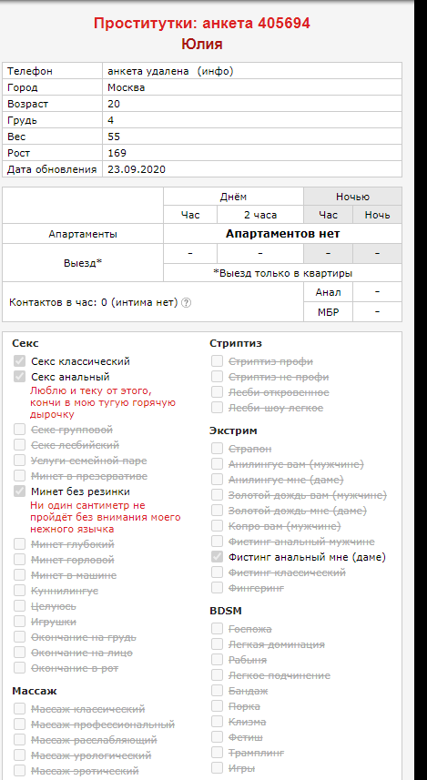 Оценки: секс: 2, минет: 4, анал: 1-, отношение к клиенту: 2, квартира: 3, в целом: 2