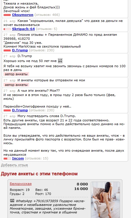 D.Trump. Вы когда нибудь доиграитесь на ИС! Феи (агенства) платят деньги ресурсу за размещение анкет (рекламы). А вы гадити в анкетах фей, в том числе у которых даже не были, да ещё пишите всякую ложь, оскорбляете фей. Со стороны автора анкеты (агенства) будет правильно, если они напишут на вас жалобу админу ИС. И как вы думаете, на чьей стороне будет правда? Советую вам пересмотреть своё поведение на ИС. Пора взрослеть!