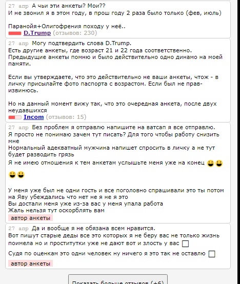 На КЛС и на ИС разная политика и разные правила. Феи на ИС имеют больше рычагов влияния на ходоков (сами знаете какие), как это не печально для нас, но это факт! Ресурс коммерческий и зарабатывает деньги на них, а не на нас. Поэтому при рассмотрении жалоб, верят как правило им. Если не верите, могу рассказать в личку, как и за что банили некоторых уважаемых Донов! D.Tramp в данном случае даже не был у фее, а утверждает, что ей 27лет, хотя по фото она выглядит на свои 19. Это легко проверяется админом ИС, скинет скан паспорта с датой рождения, по его запросу. Назвал её "ОЛИГОФРЕНКА", какое имел право на это!? Как говорится: "за базаром надо следить!". По поводу динамо, есть фейс-контроль и это её право принимать его или нет и это не повод чтобы через год таким образом мстить фее. Ещё, в комментариях она утверждает, что ссылки на анкеты, которые он дал,- это не её анкеты, админу это тоже легко проверить..и если жалоба автора анкеты подтвердится, тот кто её оклеветал будет иметь бледный вид! И ещё раз повторяю, сами феи к составлению анкет, в большинстве случаев, отношения не имеют! А на вранье я его уже ловил в его предыдущих отчётах: http://sextalk.ru/showthreaded.php?Cat=0&Number=2972708&an=0&page=0#2972708
