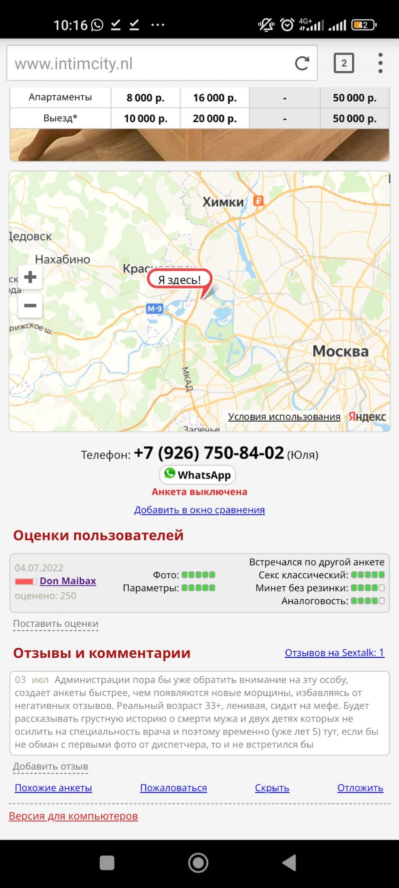 Был в январе: https://www.intimcity.nl/persons.php?id=468844. С января оценок 20 уже поставил, удаляет и клепает новые анкеты, с новыми именами: Верона, Катерина, Маша..., щас Алина. Принимала на Академической тогда, локации постоянно меняет. Сказала покидает сферу, тк устала), ну прошло полгода, с момента встречи, ещё держится. Я был за 8 к с МБР без ОВР. Цена ей 7 к с МБР и ОВР максимум. Была с диспом.