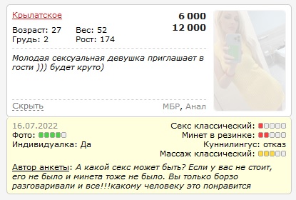 Всем привет. Наконец это произошло, самый худший поход к феи состоялся, по теории вероятности это должно было рано или поздно произойти. Итак по порядку, заприметил фею после отчета покинувшего нас Майбаха. Да по отчету это был не брюль, но вроде все норм прошло, еще было привлекательно то, что много галочек стоит не как допы. В отчете упоминалось, что фея в августе закончит и улетит. Давай схожу, фаворитки не вызвонились и я решил рискнуть. На трубе сама, адрес получен. Но есть условие – по приезду, оплата переводом на карту. Добрался почти без проблем, у метро постоянный ремонт, можно не сразу сориентироваться где нужный дом. Вообщем дом нашел, я поднялся и оказался в квартире. Квартирка однушка, средненький ремонт. В комнате кровать, где спит там и работает. В квартире есть собачка, не шумная но любопытная, прошу что бы при действии ее не было. Пока я расплачиваюсь переводом, фея договаривается с новым клиентом. Подход деловой, ну а что время деньги. Принял душ, вернулся в спальню. Фея в черном лифчике и трусиках, по ТТХ вроде все совпадает. А что процесс? Фея смотрит куда то вдаль, куда угодно но не на меня, снимает лифчик и начинает себе титьки мять. Укладываю ее, хотел поцеловать грудь, нет целовать нельзя только трогать. Жестами объяснил, что надо трусики снять. Снимает, на меня вообще не смотрит, глаза полузакрыты и постоянно мнет себе грудь. Прошу куни. -Куни доп +1000 р. - В анкете указана что входит в стоимость. Марго пофиг, она меня не слышит и продолжает наяривать сиськи. Ну давай минет попробуем, надеваем на вялого и на полшишечки, что? В анкете глубокий написан? Хорошо что не спросил, а то узнал бы много нового, что не так в анкете. Вообщем мне стало понятно, что феи это все не интересно. У меня всякие походы были и феи разные встречались. Ленивые, уставшие, после бурного загула. А тут на тебя просто пофиг, на тебя даже не смотрят и еще успевают одной рукой в телефоне что то смотреть. Да именно так, одной рукой йенг оживляет второй рукой кнопки успевает нажимать. Прошу массаж. Достает масло и двумя руками изображает массаж. Минут через 10 говорит что руки устали и массаж закончен. Руки устали, но грудь наминает себе, вообще выглядит это странно. Девушка в непонятном состоянии, глаза закрыты, мнет себе груди, а на клиента насрать. - Ну что мне предлагается бревно трахать? После этого она встает, окрывает дверь, куда вбегает собачка и отсаживается с телефоном в кресло. -Я же просил, что бы собачки не было в комнате. - Вы мою анкету читали и знали что у меня собака есть. - Хорошо, есть собака. Но она же могла остаться на кухне. - Вы анкету мою читали, собака на кровать не заскочит. - Читал, и про куни там тоже прочел и что? - Анкету поправлю. Ну что остается делать, буду лежать и прокрастинировать, послушаю муз канал по телеку. Лежу успокаиваю себя, мне заявляют что скоро новое тело должно прибыть. И через некоторое время в дверь позвонили, неужели такое бывает? Но нет пока это дно не пробили, пришел курьер с посылкой. Ладно, встречаться с новым клиентом мне не хочется. Оделся, пожелал удач в бизнесе и ушел. PS. На будущие надо запомнить такой маркер, фея дорабатывает и улетает, в общем на бизнес можно забить. Жалко, что она вчера не свалила.