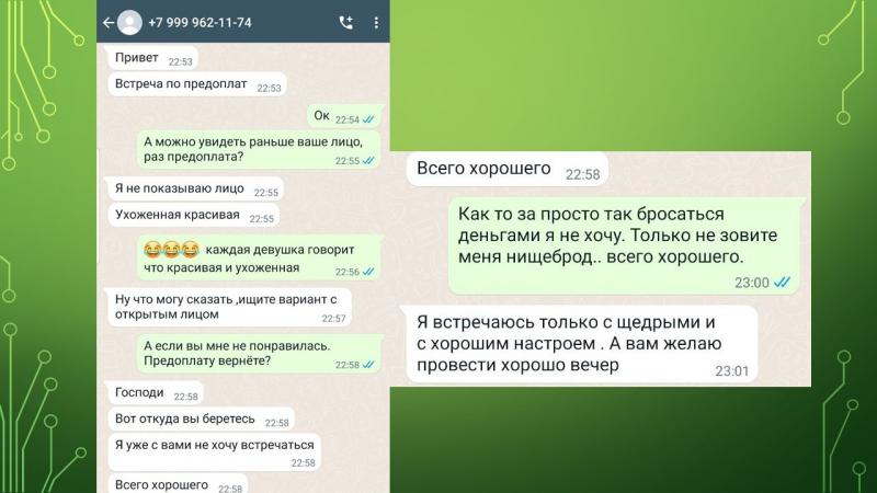 Ключевое слово из всей переписки "щедрые". Переводим на русский язык...присылаешь предоплату , приезжаешь, а там крокодил. Либо приходится доплачивать, ипать и плакать , либо предоплата означает вашу щедрость Зы. Мика я только не понял в чем прикол...у телки куча негативных оценок, а ты ринулся с ней контачить???