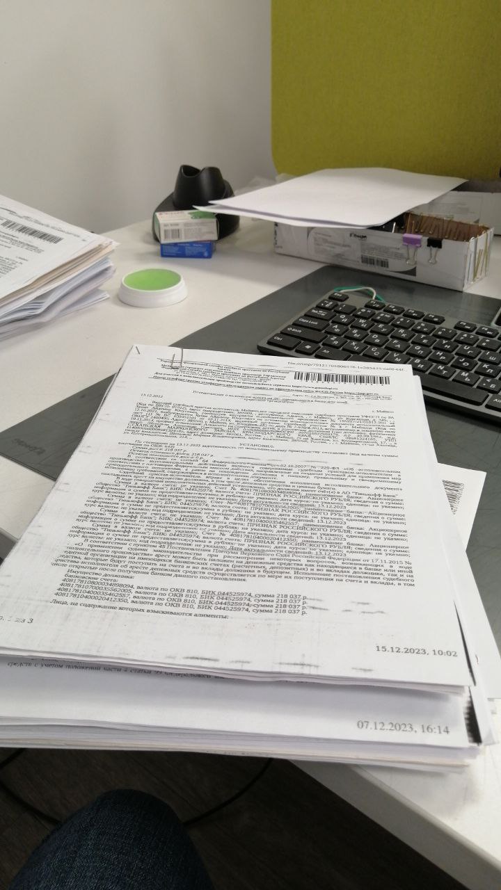 Один листочек А4 (тут 2). Остальные доки снизу - это ещё пачка штучных постановлений от судебных приставов. Может быть арест, может быть взыскание, может быть ошибочное, или юр.лиц натягивают на конфискацию (но там счета не 40817...или 423...), могут сами приставы облажаться и не то распечатать, перепутав реквизиты в начале документа и в конце или вообще на обратную сторону другого человека присобачить (отказ в исполнении).