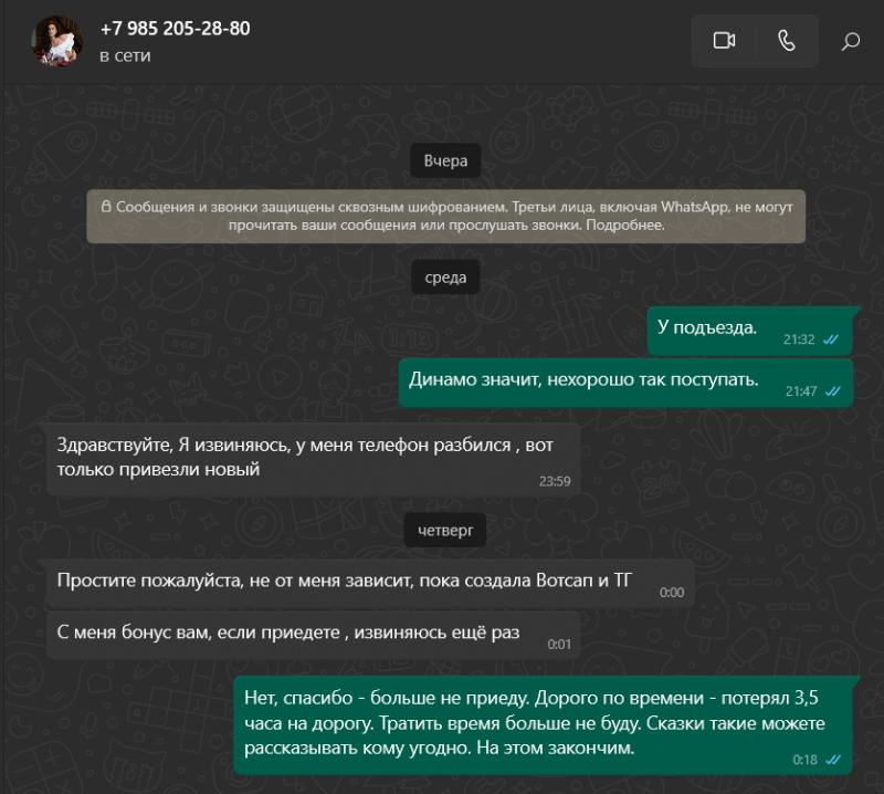 Как вы догадались это ещё не конец истории. Через 3 часа от назначенного времени в WhatsApp девушка разродилась извинениями с рассказом, что у неё телефон разбился и вот только-только ей привезли новый, она установила WhatsApp и сейчас мне написала. Пригласила приехать ещё раз с обещанием бонуса от неё. На что я вежливо ответил, что уже потратил своё время и больше не приеду. Связав все факты, что добыл, воедино, я понял, что это динамо по чёрному – после одного раза, будут пытаться прокатить второй, а особо доверчивых и в третий, рассказывая небылицы о причинах. У меня нет телеграмма и я не могу поставить отметку о динамо в анкете (пользуюсь только WhatsApp ввиду особенностей моей спецификации) – но отчёт накатать в моих силах, дабы предупредить донов.