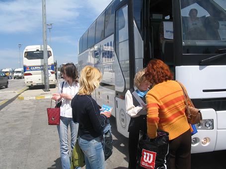 У автобуса Вас встретит гид трансфермен. Называем свою фамилию, гид проверяет по спискам и все...Отдаете багаж водителю и топаете в автобус.