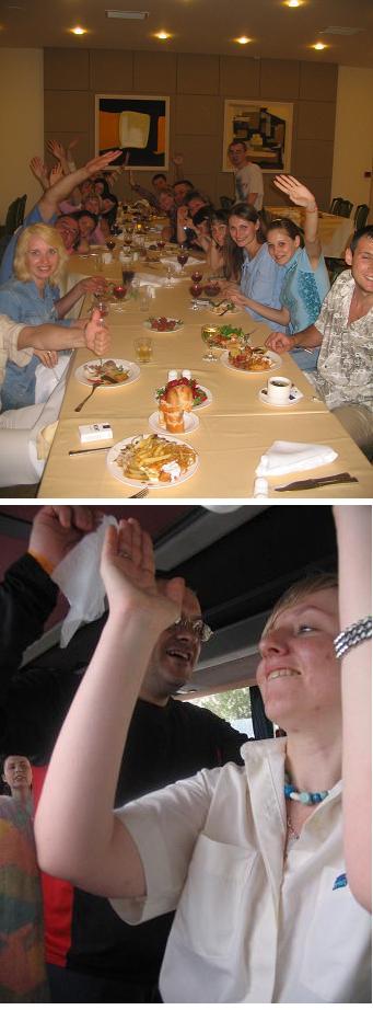 На фото. Последний ужин. (правда догадалась сфоткать, когда все уже все доели и собирались на танцы) и танцы в автобусе по пути в аэропорт.