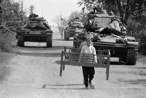 Комментарий к приаттаченной фотке: Lai Khe Vietnam VIETNAM - UNDATED: Military tanks drive down the road while refugees escape the fighting near Lai Khe, Vietnam in 1973 during the Vietnam War. Photographer: David Hume Kennerly