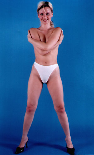 соски не набухают и не твердеют. похоже грудь не очень чувствительна, чего не скажешь о киске - мокнет хорошо. не узка. кста, область "бикини" побрита наголо.