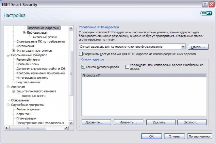 Сделал все по инструкции. Список заблокированных сайтов - пуст и удалять там нечего; прописал интимсити в адресах, для которых отключено сканирование - все равно блокирует. Видимо, эти адреса вместе с базами сигнатур хранятся-обновляются, и юзерам недоступны, в общем, завязываю с блядками