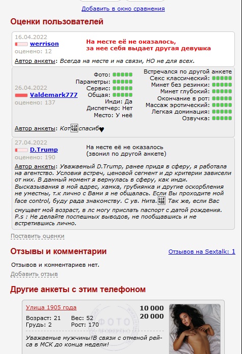 И что па вашей логике если феи платят бабки за анкеты значи они могут делать все что угодно!?! - ставить другой возраст , динамит клиентов - ИС это двухсторонняя площадка - не будет клиентов, феи не будут размещать анкеты, поэтому каждый такой случай надо рассматривать отдельно...Фредович не попал к фее о чем и написал, далее указал на несоответствие возраста - это тоже важно, чтобы дева не вводила народ в заблуждение, а то работает уже 3 года, а все 19 лет..