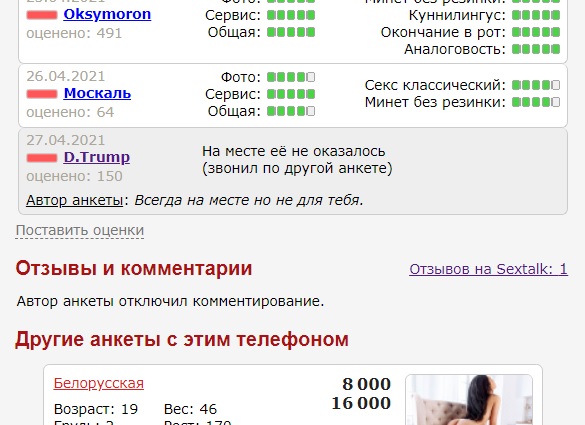 На КЛС и на ИС разная политика и разные правила. Феи на ИС имеют больше рычагов влияния на ходоков (сами знаете какие), как это не печально для нас, но это факт! Ресурс коммерческий и зарабатывает деньги на них, а не на нас. Поэтому при рассмотрении жалоб, верят как правило им. Если не верите, могу рассказать в личку, как и за что банили некоторых уважаемых Донов! D.Tramp в данном случае даже не был у фее, а утверждает, что ей 27лет, хотя по фото она выглядит на свои 19. Это легко проверяется админом ИС, скинет скан паспорта с датой рождения, по его запросу. Назвал её "ОЛИГОФРЕНКА", какое имел право на это!? Как говорится: "за базаром надо следить!". По поводу динамо, есть фейс-контроль и это её право принимать его или нет и это не повод чтобы через год таким образом мстить фее. Ещё, в комментариях она утверждает, что ссылки на анкеты, которые он дал,- это не её анкеты, админу это тоже легко проверить..и если жалоба автора анкеты подтвердится, тот кто её оклеветал будет иметь бледный вид! И ещё раз повторяю, сами феи к составлению анкет, в большинстве случаев, отношения не имеют! А на вранье я его уже ловил в его предыдущих отчётах: http://sextalk.ru/showthreaded.php?Cat=0&Number=2972708&an=0&page=0#2972708