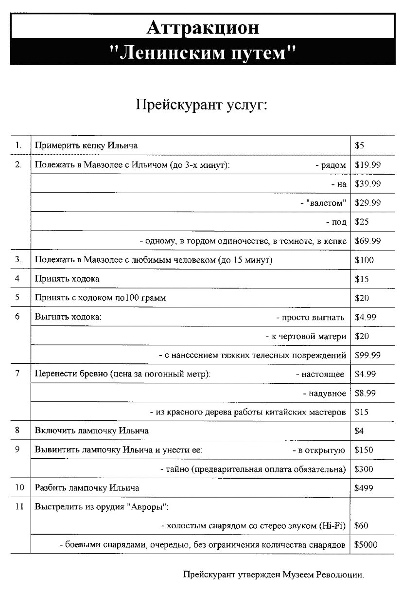 - Научить песдеть как Троцкий (почасовая - 15 долларов) - Отучить песдеть как Троцкий (почасовая - 30 долларов) - Написать письмо съезду (литературно - 300 долларов) - Написать письмо съезду матерно-художественно (500 долларов) - Обучить КСиться в жанре литработ Ильича типа: ШГ вперед, два ШГ назад..(почасовая - 100 долларов), - Фотосъемка "ню" в стиле "Ленин в Октябре", "Ленин в январе" и т.п. в другие сезоны с и без фотошопа (50/100 долларов). - Оргия в стиле "Ленин в Польше" с привлечением художников для запечатления (500 долларов). - Для дантистов отдельно ролик в стиле Ильич с замотанной челюстью беседует с народом перед кабинетом дантиста (5000 долларов) - Для чаеводов: Вова отправляет солдата за эКСклюзивным чаем (5000 д.) - Для монгольских коммерсантов (СухэБатор и Ленин составляют бизнес-план), ролик - 5000 долларов. - Порноролик: наш ответ Керзону и Чемберлену - 50 тыс.долларов. - Порноролик: Как нам реорганизовать Рабкрин - 50 тыс. долларов. - Порноролик: от Крупской к Арманд - 100 тыс.долларов Организация мировой революции с реквизицией у Америки Форт-НоКСа и передачи его габочим и кгестьянам - 100000000000000000000000000000 долларов