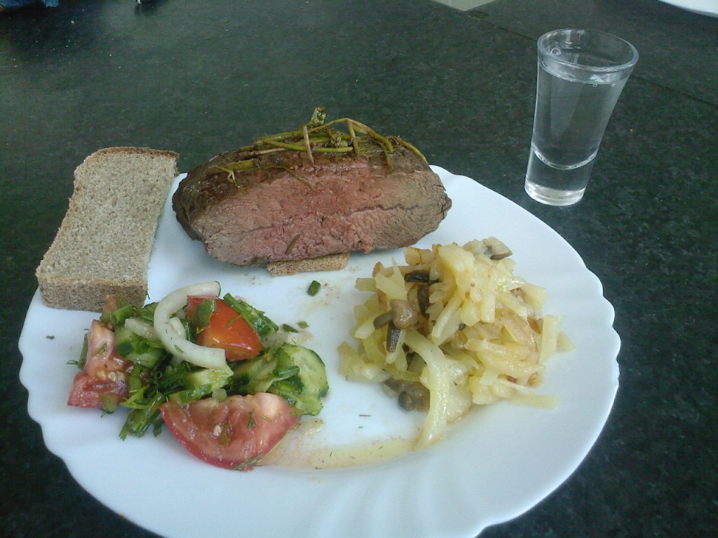Ну, а сам рецепт, полагаю, ни у кого удивления не вызовет. Тем не менее, как это делал я: - мясо запекается в пакете вместе со специями (тут уж каждый может выбрать любимые – это не принципиально). Вначале его «обжигаю» при максимальной температуре, пока не увижу корочку. Потом готовлю минут 30 при 180 градусах, и в конце оно подходит минут 15 при 90 градусах. - в это время жарю картофель, куда сразу кладу грибы (с ними блюдо получается как-то веселее и насыщенней), а в середине готовности – лук полукольцами. - без свежей зелени закуска считается неполноценной, а потому внимательный Дон увидит на тарелке ещё и салат из овощей.
