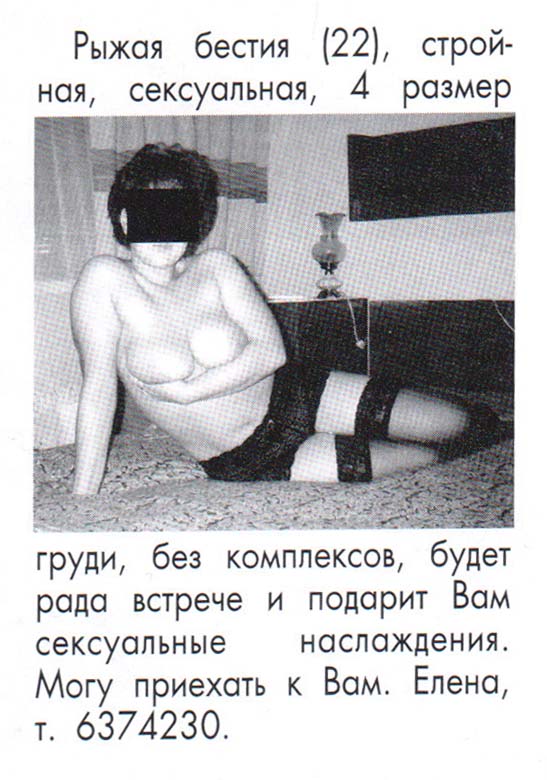 Шок номер два-в отель никто не едет.От просто"Я в гостиницы не выезжаю" до Диалога"А где Ваш отель находится?А,в центре..Нет, не поеду...А как ваш отель называется?Нет я в такие гостиницы не езжу!" В какие-такие то?Честное слово,вполне пристойные отели (2 раза такие диалоги были, в разных отелях), не Ridzene и не Latvija но уж совсем не отстойные клоповники, нормальные 3 ***.А Центр чем плох? В общем, засада. Ещё раз повторюсь, выезжать поздно вечером куда-то под холодным дождём было просто влом. Так что приаттаченный сабж оказался просто ЕДИНСТВЕННЫМ вариантом из тех, кому до 30(ну не люблю я mature). Фотки тогда не было,(в аттаче -скан из последнего, декабрьского номера Zirafe, пардон за качество),текст совпадал. Позвонил-15Ls./час. Плюс попросила 2Л на такси - согласился, а что делать? ;( Приехала быстро, минут через 20,вместе с мужиком лет 50, деньги отдал ему -30Л за 2 часа(как-то 1 час ну уж совсем несерьёзно). По тогдашнему курсу - 51$,2ч что по московским меркам совсем бюджетно. Позже сказала, что мужик-не сутер, а извозчик+типа охранника. Когда сняла пальто, присела и начала говорить-понял, что попал.Ну полная "хохлома", но без "хэканья".Говорит, что из Огрэ(это крохотный городок километрах в 70 от Риги), русская.Фото соответствует на 100%, такой типаж "хрюшки" с перманентными кудрями.Грудь действительно 4-ка, но - чудес не бывает, висит(не зря она на фото её руками держит).В положении лёжа-растекается по бокам  Абсолютная цифра.Правда старается.Но как-то скучно всё.Минет(в резине) старательный, но механический какой-то. Так вроде всё умеет -и "наездница" и в миссионерской лежит не бревном, и в ЗКП прогибается.Но цифра-а-а. Понял, что несмотря на жестокий спермотоксикоз, кончить не смогу. Снял резину, дал девушке йенг в руку, сцепил зубы и,скорее усилием воли, нежели стараниями девицы, кончил таки на груди 4-го размера.Хоть вид неплохой получился, прямо cumshot из немецкого порно. Посткоитальный разговор что-то тоже не пошёл, ну полное "дерево" девушка. Короче, отпрвил её восвояси ещё до наступления второго часа, как-то тошно стало.Явно обрадовалась,просила звонить в следующий приезд,телефон по-моему тот же(стёр).В общем, комплексов у девахи точно нет, однако на "бестию" явно не тянет. Итого, по форме отчёта Имя: Елена(говорит,настоящее) Телефон: 6374230 Вораст: 22 Рост: 162-165 Грудь: 4 Вес: 75-80(ориентировочно) Цена: 15Ls.час Выезд: Да КС: 2 Минет: 2 ШГ Не спрашивал Отношение к клиенту 3(за старательность) Пойду ли ещё: НЕТ Да и не посоветую благородным КЛС-никам, разве что найдётся любитель этакой "цифровой хохлушки", в ваших краях довольно экзотичной, но я уж точно не любитель.