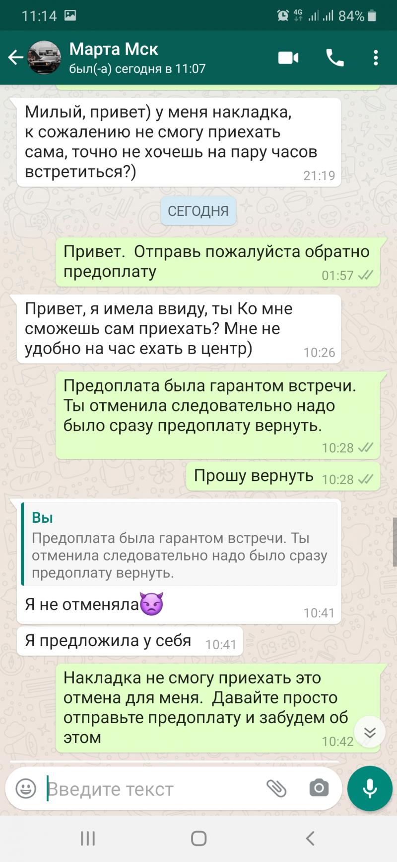 Хотел встретиться с ней по программе всё включено 10т как указано на сайте. Хоть и написано что всё включено видеосъёмка не включается. Со съемной выезд на 1час =13т. Ну так и быть договорился за сутки выезд ко мне. Списывался по вотсап, сказала необходима предоплата 3 тыс, постоянно пыталась навязать 2часа за 20т. Не говорю 1час за 13. Но предоплату выслал. Договорились. Позже вечером присылает сообщение: "у меня накладка, к сожалению не могу приехать сама, точно не хочешь на пару часов?". Понимаю пациент тяжелый, и поспешил с предоплатой. Прошу её вернуть предоплату. Начинается цирк денег не верну из за тебя потеряла клиента и т д. Начинает обещать будущие встречи и т. д. Кормит завтраками. Я то для себя решил встреча после такого общения хорошо точно не сложиться. Девица меняет планы на ходу. В конце сдается говорит приедет.. но мне такого точно не надо. Очень хитрая баба. Деньги так и не вернула. Могу приложить переписку в вотсап.