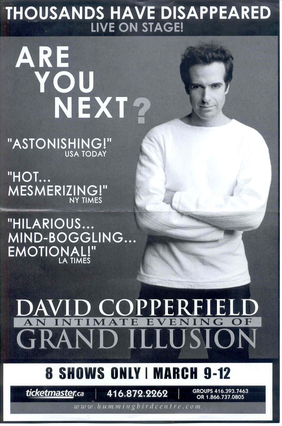 Ну,что сказать... Побывал на шоу Дэвида Копперфильда. Впечатление двоякое... С одной стороны,конечно - о@уйеть мона!  Сидел в партере,посреди зала по центру.Строго за моей спиной,стояла меж рядов какя-то хрень.Глянул - тумбочка,сверху решетка,а под ней вентилятор.Пожал плечами... Во время представления,когда он исчез со сцены,и вдруг в лучах света возник на этой хрени,с эффектно поддуваемой снизу расстегнутой рубашкой,я обернушись,сватил его за брюки,дабы убедиться,что живой,не голограмма...  Конечно,когда он берет за хвост живого скорпиона,и подносит его к колоде карт,откуда тот клешней вытаскивает загаданную - более,чем эффектно. Хер пойми откуда на сцене,среди кучи случайно поднятых из зала людей,возникает огромный лимузин - эффектно. Кидает в зал наугад пластмассовые тарелочки...Поймавшие люди выходят на сцену.Он сажает их в кресла...Дает каждому по фонарику...Они ими вовсю размахивают.Их накрывают материей...Фонарики продолжают просвечивать...вдруг материя сдергивается - под ней пустые кресла...А вся толпа с оторопелыми лицами стоит в партере продолжая фонариками махать - охренеть можно!  Короче - мне очень понравилось! Но! Все ж таки Додик,(еврейский парень с русскими корнями) - не прав. Я не скажу - сколько стоят билеты на его шоу...Верней - сколько мы заплатили...(Жена сказала,что еслиб мы купили билеты,как я - мудак,настаивал,на первые три ряда,то ее б точно кондратий посетил). За те бабки,которые он рубит,продолжительность представления - 1 час 15 минут. Мало,конечно...Тем более,что зал вмещает 3500 человек. Уж мог бы и 2 часа поработать. Но по-любому...Хоть я и верю в его,как и Дэвида Блэйна,и Игоря Кио не совсем человеческие способности... (У меня в Москве притель был..Колдун..Самый натуральный..Так вот,мы с ним о многом в свое время судачили..И он клянется,что есть на планете люди,которым дано то,о чем мы и не мечтаем..В частности - летать и левитировать они могут). Так вот,пусть это все - иллюзия и трюки. Но какого же уважения заслуживают люди их придумывающие и творящие!
