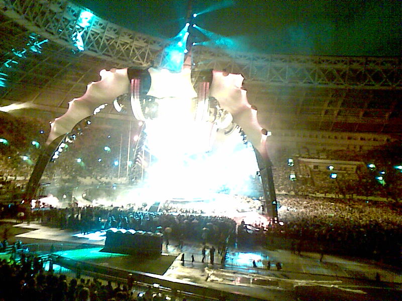 На сцене были такие прикольные зонты, похожие на фантастические грибы. Надо отдать должное музыкантам - под зонтом только барабанщик сидел, да клавиши стояли, а все самоотверженно промокали вместе со зрителями. Боно, красавец, как в детстве по лужам прыгал.