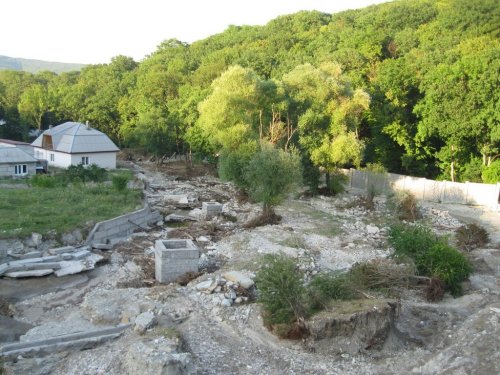 При допущении, что пруд в фазе его полноводия (22.06.12) имел прямоугольный профиль и глубину 10 м, объем воды в нем при S = 45 000 кв.м составил бы 450 000 кубометров. Если бы 2/3 этой воды было сброшено через отводящий канал + перелилось через край дамбы, то в долину попало порядка 300 000 кубометров. Этого количества недостаточно для создания катастрофического наводнения и волн высотой в 7-8 м, в чем пытаются убедить нас отдельные корреспонденты. Прикрепленное фото с невредимым домом (а это рядом с дамбой) может вызвать лишь улыбку.